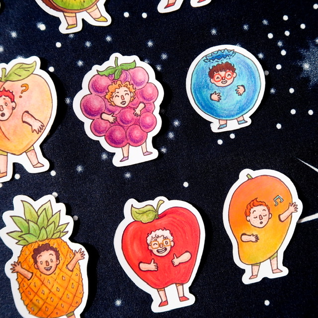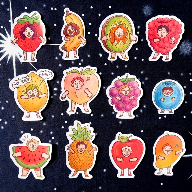 It's exactly what it sounds like; just a bunch of fruits dressed as fruits! Pack of 12 die-cut stickers, printed on glossy sticker paper Ranging from 4cm to 7cm in size